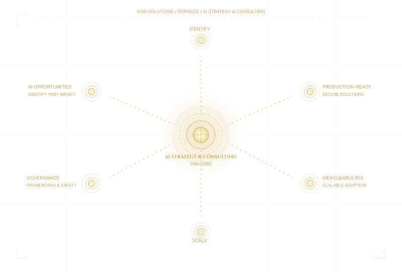 Transform AI vision into measurable ROI. VGAI helps organizations identify high-impact AI opportunities, design secure production-ready solutions, and build governance frameworks that ensure safe, scalable AI adoption.